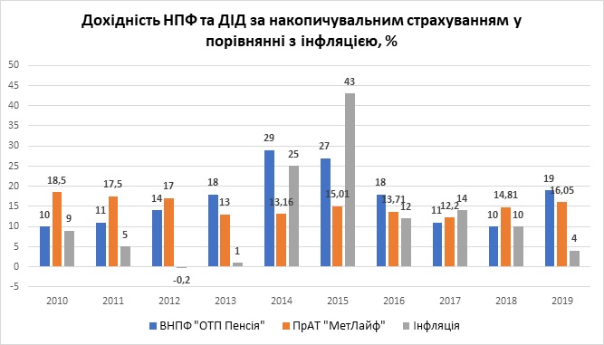Рис. 1. Дохідність НПФ та ДІД за накопичувальним страхуванням у порівнянні з інфляцією у 2010-2019 рр.