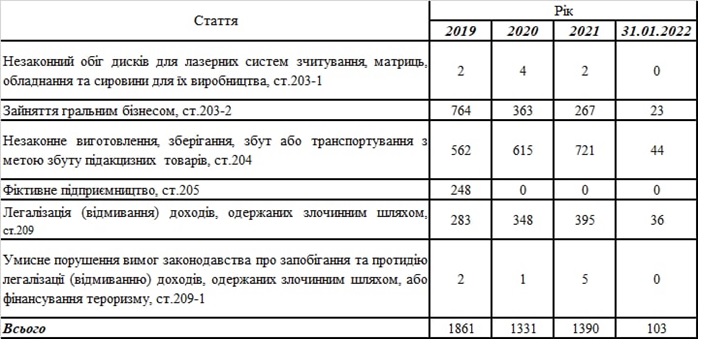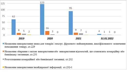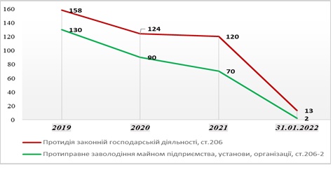 ГРУПА1: Діяння, що порушують принцип свободи підприємницької діяльності, а саме перша підгрупа – «Злочини в сфері організації порядку зайняття підприємницької діяльністю» за відповідними статтями ККУ впродовж 2019-2022 рр.