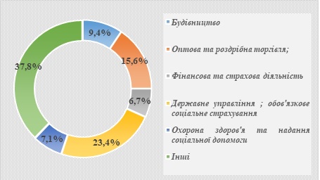 Найбільш вагому частку (23,4%) в структурі злочинів на підприємстві займає сфера державного управління. Трохи меншу оптова та роздрібна торгівля (15,6%), далі будівництво (9,4%), фінансова та страхова діяльність(7,1%) та інші.